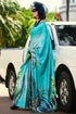 Jazzy Firozi Digital Printed Satin Silk Saree With Hypnotic Blouse Piece