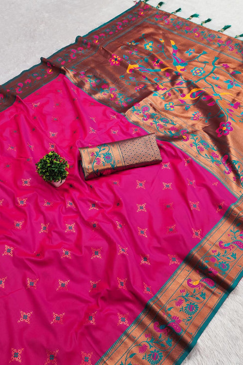 Amazing Dark Pink Paithani Silk Saree With Prominent Blouse Piece
