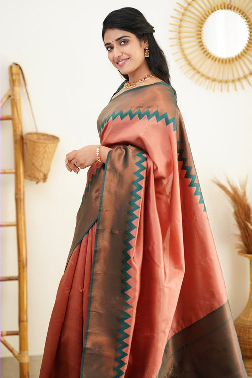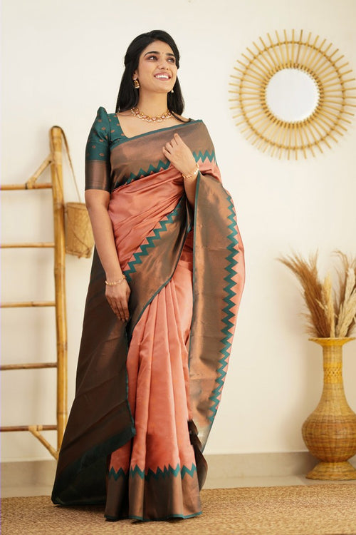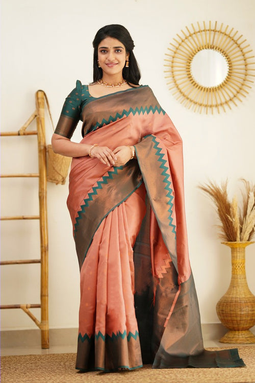 Fantabulous Peach Soft Banarasi Silk Saree With Invaluable Blouse Piece
