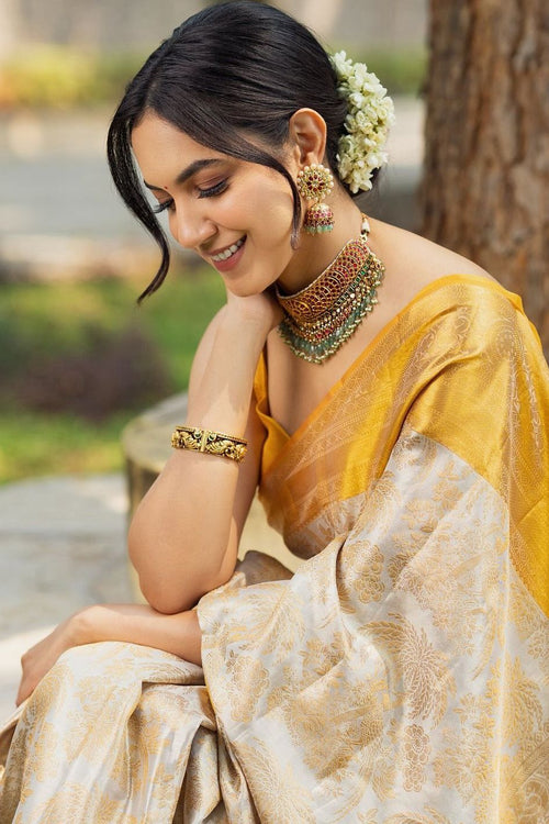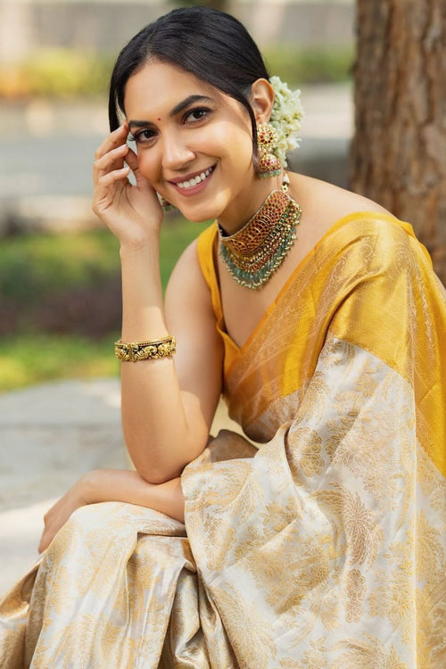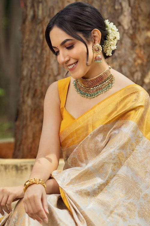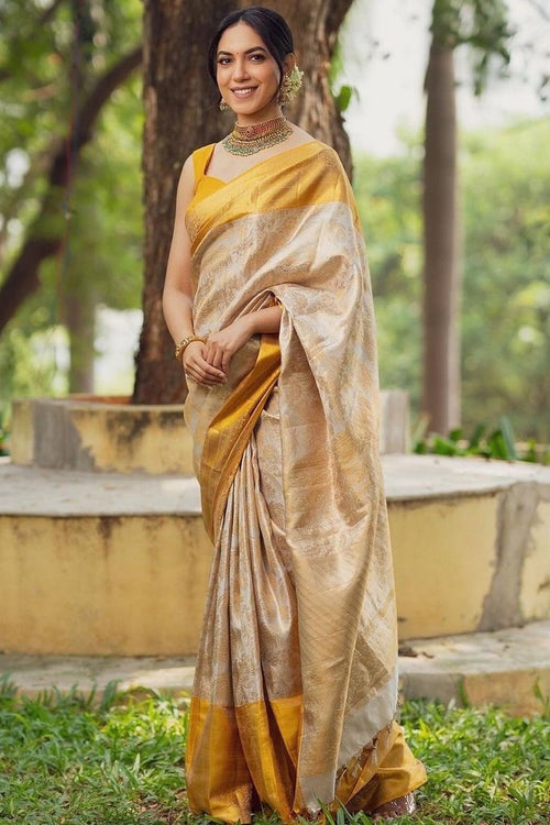 Imbrication Beige Soft Silk Saree With Embellished Blouse Piece
