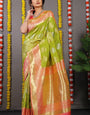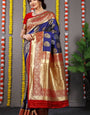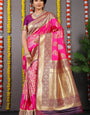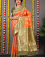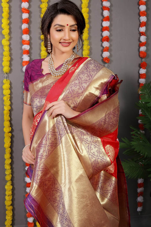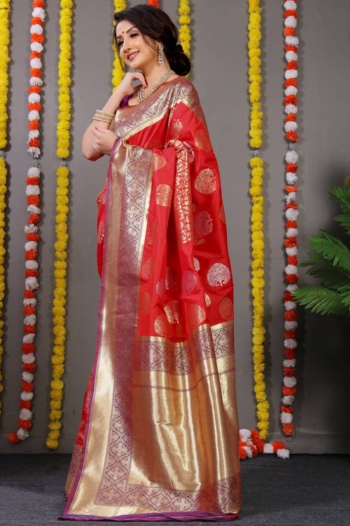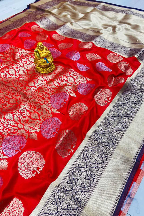 Incomparable Red Banarasi Silk Saree With Comely Blouse Piece