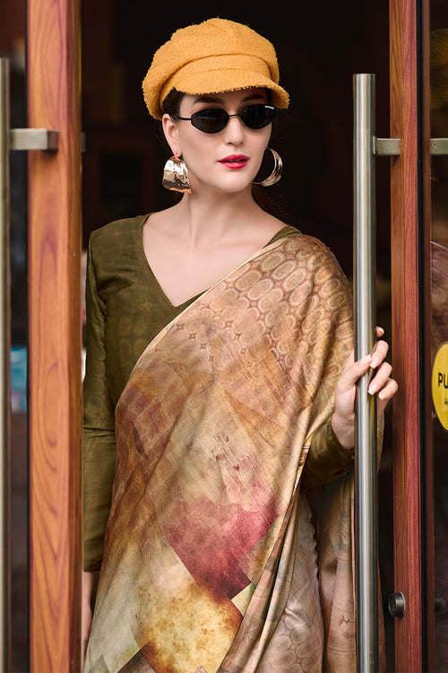 Profuse Beige and Brown Digital Printed Satin Silk Saree With Elaborate Blouse Piece