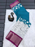 Tempting Firozi Digital Printed Dola Silk Saree With Resplendent Blouse Piece